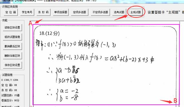 试题信息:显示当前识别区块设置信息,包括试题数量、试题类别、各试题类别总分,试卷满分等信息。